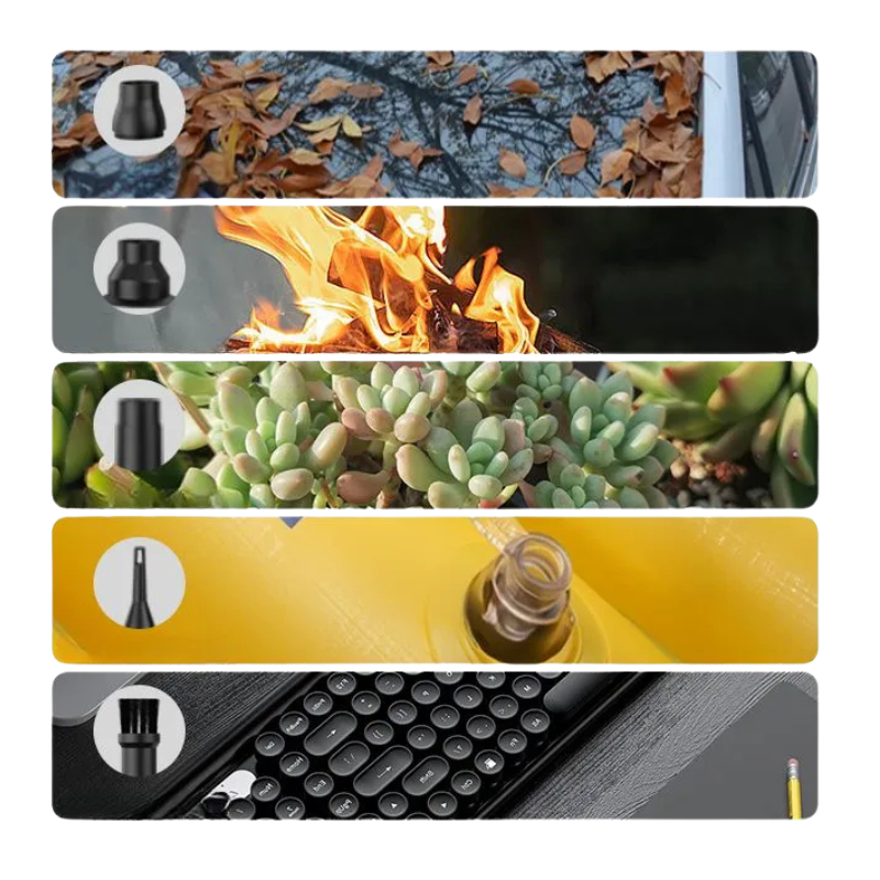 מגיע עם אביזרים רב-תכליתיים לכל משימה: משטחי בית, פנים רכב, ניקוי גינה, טיפוח חיות מחמד, ניקוי אבק מאלקטרוניקה, ואפילו מנגלים וניפוח.